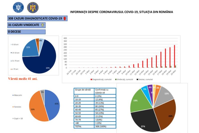 Până astăzi, 20 martie, pe teritoriul României, au fost confirmate 308 cazuri de persoane infectate cu virusul COVID – 19 (coronavirus). Dintre cele 308 de persoane confirmate pozitiv, 31 au fost declarate vindecate și externate (22 la Timișoara, 8 la București și unul la Iași).