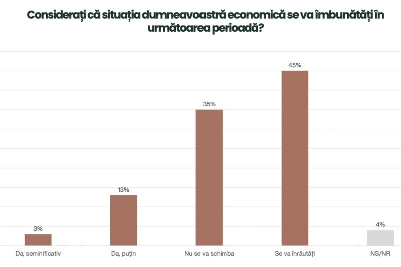 În strânsă dependență se află și răspunsul la întrebarea "Cum apreciați situația economică actuală a României?": într-un procent jenant, de doar 1%, românii spun că situația economică este "foarte bună".