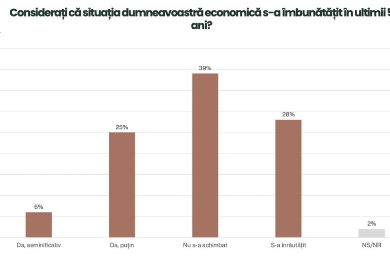 În ceea ce privește situație economică din ultimii 5 ani, românii spun că aceasta este fie neschimbată, fie înrăutățită. Și nici prea optimiști nu sunt că se va schimba ceva, în viitorul apropiat.