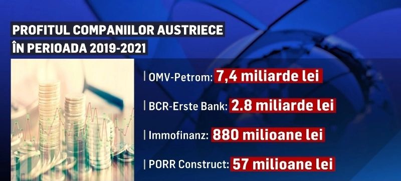 Peste 7,4 miliarde de lei a fost profitul înregistrat de OMV în perioada 2019-2021. În același interval, BCR-Erste Bank, compania care deține Banca Comercială Română, a avut un profit net de 2,8 miliarde de lei. Immofinanz, un grup imobiliar, s-a bucurat de peste 880 milioane lei profit, iar Porr Construct a înregistrat un profit net de 57 de milioane de lei.