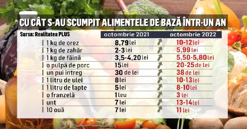 Fata de aceeasi perioada a anului trecut, pe un cos de cumparaturi care contine doar 11 alimente de baza ajungem sa platim cu 45 de lei mai mult din cauza valului de scumpiri, in contextul in care inflatia se apropie de pragul de 16 procente.