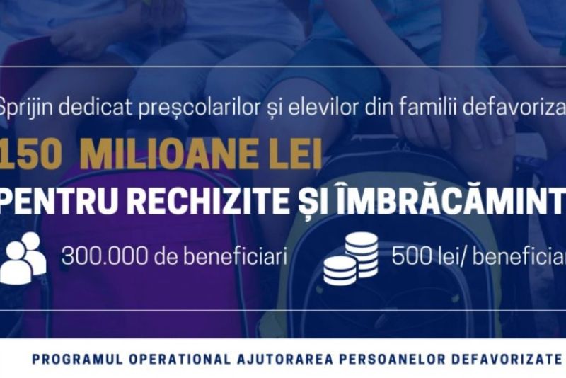 Ministerul Investițiilor și Proiectelor Europene, prin Programul Operațional Ajutorarea Persoanelor Defavorizate (POAD), va acorda în acest an școlar ajutoare pentru rechizite și îmbrăcăminte în valoare totală de peste 150 de milioane de lei preșcolarilor și elevilor din familiile defavorizate.