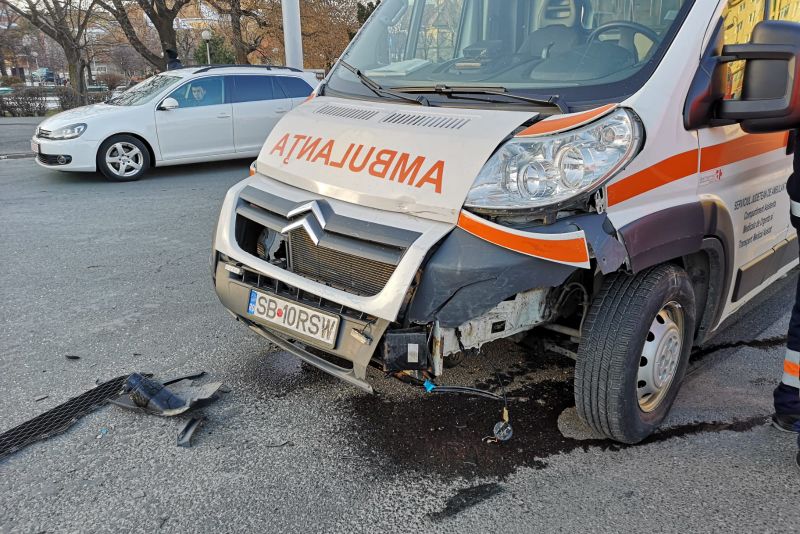 O ambulanță de tip B1/B2 a Serviciului Judetean de Ambulanță Sibiu a fost implicată într-un accident rutier în sensul giratoriu de la spital. Se pare că un șofer 28 de ani, sibian, a pătruns în intersectie dinspre strada Podului fără să acorde prioritate. A intrat asftfel în coliziune cu ambulanța care era condusă regulamentar dinspre Constituției spre Bâlea. Polițiștii spun că semnale acustice și luminoase erau în funcțiune.