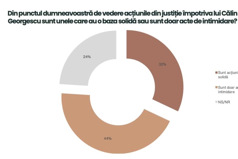 La întrebarea "Din punctul dumneavoastră de vedere acțiunile din justiție împotriva lui Călin Georgescu sunt unele care au o baza solidă sau sunt doar acte de intimidare?", românii au răspuns că acestea sunt, mai degrabă, acte de intimidare.