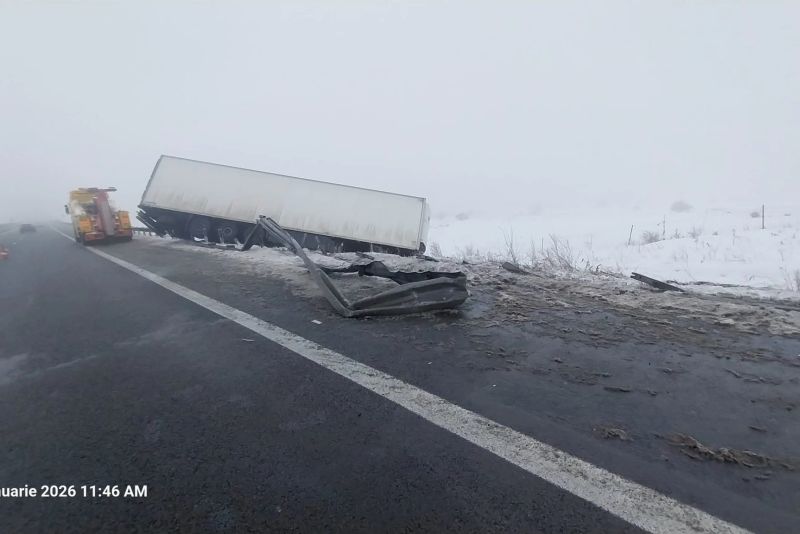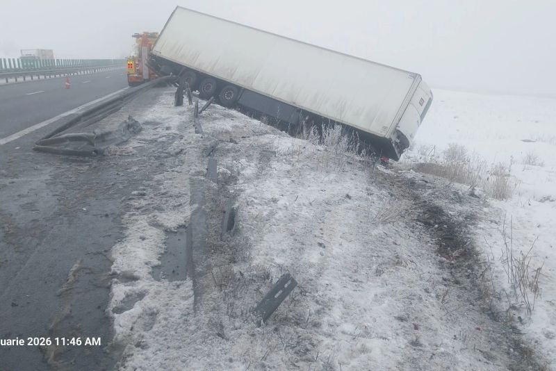 Un TIR s-a răsturnat pe autostrada A1, între Săliște și Apoldu de Jos, iar circulația rutieră este restricționată, miercuri după-amiază, pe sensul de mers Sibiu–Sebeș. În prezent se lucrează la ridicarea autotrenului.