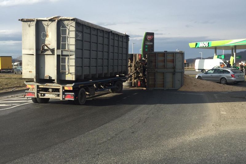 Șoferul camionului încărcat cu rumeguș a pierdut controlul volanului și s-a răsturnat, iar rumegușul s-a împrăștiat pe carosabil. Din fericire nu au fost înregistrate victime.
