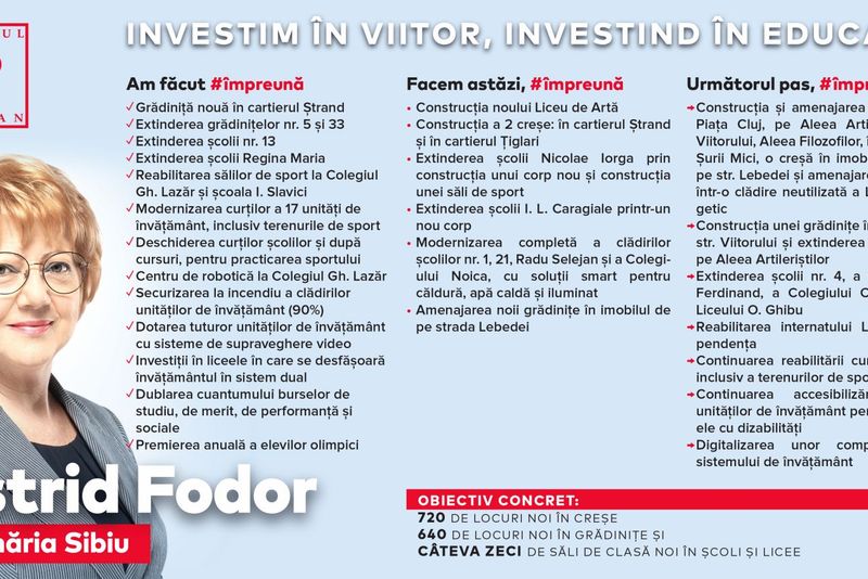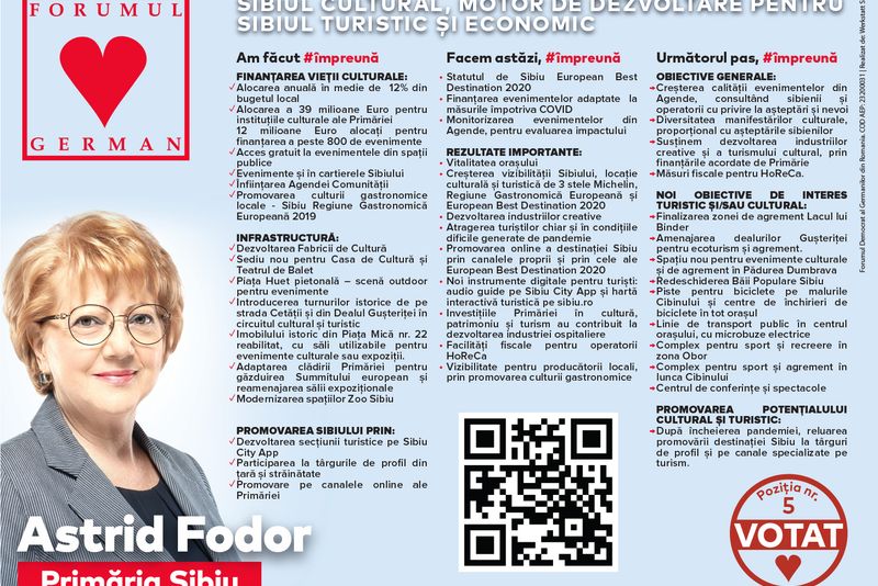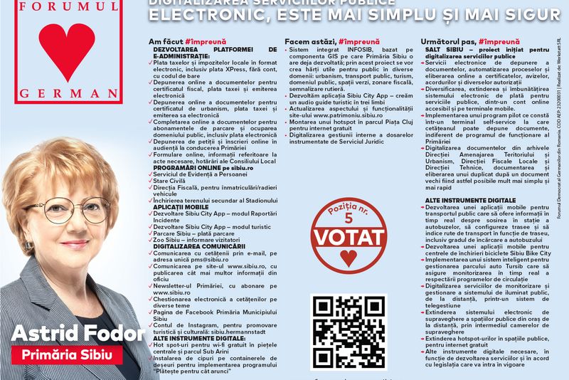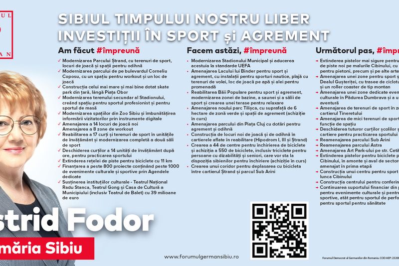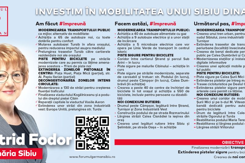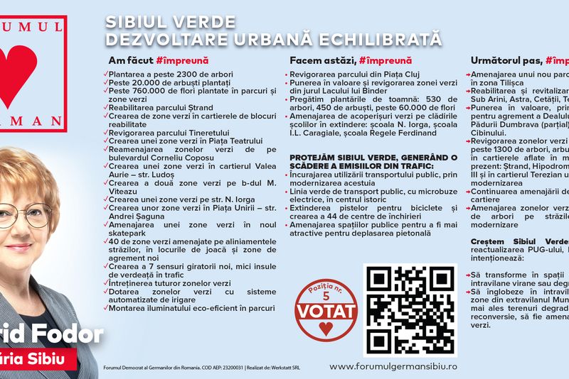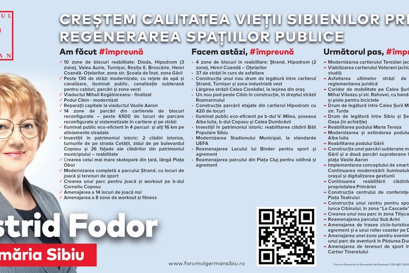 FDGR a ales acest cuvânt – ÎMPREUNĂ – ca motto al programului său. Consider că este ideea care a guvernat atât istoria, cât și prezentul orașului, dar, mai ales, va marca viitorul. În primul meu mandat mi-am propus să deschid administrația orașului către comunitate, iar în mandatul pe care mi-l doresc și pentru care cer votul de încredere, vreau să fac mai mult decât atât: vreau să administrăm orașul împreună cu sibienii. Este o constatare pe care am făcut-o cu fiecare proiect: cetățeanul cunoaște cel mai bine realitatea din cartierul său și din orașul nostru pentru că e cel mai aproape de Sibiul real, dincolo de hârtii și planuri. Vă prezint câteva dintre proiectele pe care sper să am oportunitatea și bucuria să le realizez în următorii patru ani pentru Sibiul nostru, împreună cu sibienii.