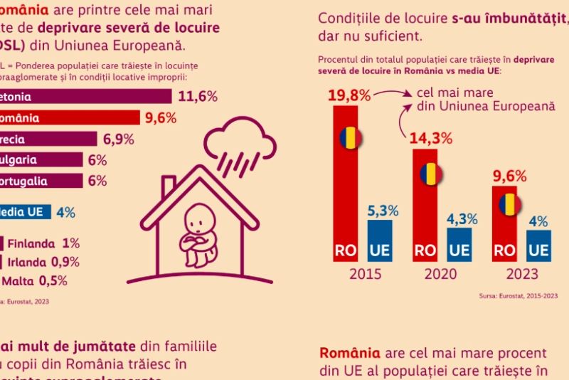România se află în rândul țărilor UE cu cel mai mare procent din populație care trăiește în condiții de locuire extrem de precare. 9,6% din populația totală a țării noastre se află în deprivare severă de locuire, arată datele oficiale ale Eurostat pe anii 2023-2024, prelucrate de Monitorul Social, proiect al Fundației Friedrich Ebert. Rata deprivării severe de locuire este definită ca procentul populației care locuiește într-o locuință considerată supraaglomerată, care prezintă în același timp cel puțin una din caracteristicile următoare: acoperiș cu scurgeri, fără baie/duș și fără toaletă interioară sau o locuință considerată prea întunecată.
